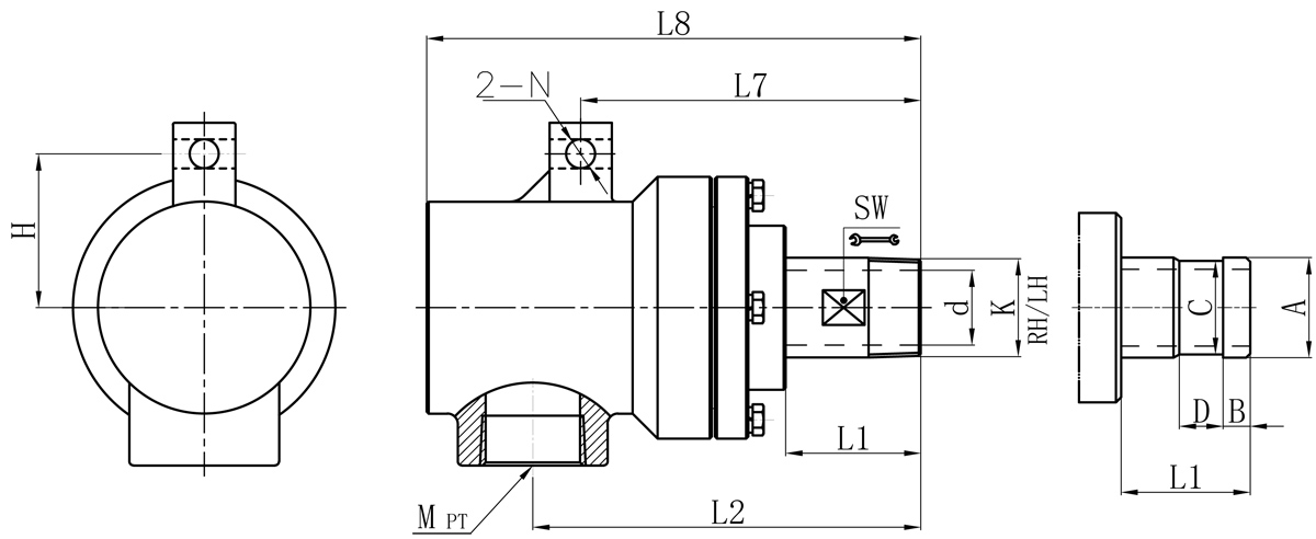 | Model | K | M | d | L1 | L2 | L7 | L8 | N | H | SW | 法蘭式外管尺寸對(duì)照表 | |||